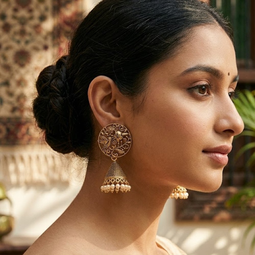 Elevate your traditional look with these stunning Golden Metal Antique Afghan Jhumka earrings, inspired by rich ethnic heritage and timeless craftsmanship. Designed with intricate detailing and a bold antique finish, these jhumkas bring a perfect blend of vintage charm and cultural elegance. Their unique Afghan-style design makes them a standout accessory for festive occasions, weddings, and cultural events.