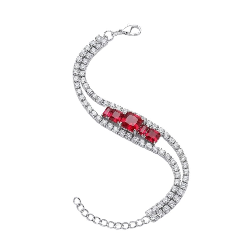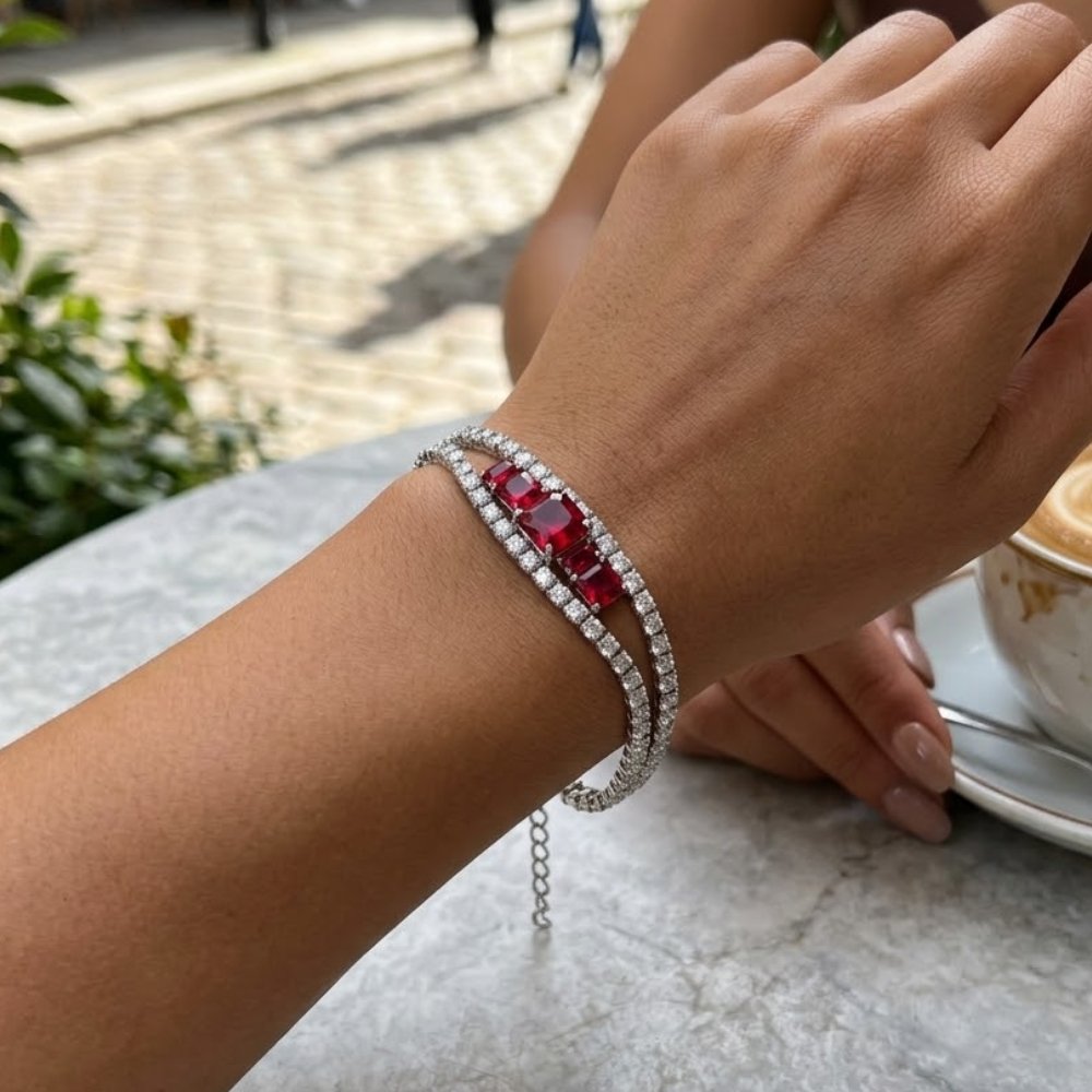The Silver Crystal Bracelet with Red Gem Accent is an elegant jewelry piece designed to bring brilliance and sophistication to your style. Featuring a sparkling silver-tone crystal band with striking red gemstone accents at the center, this bracelet creates a luxurious contrast that makes it perfect for both formal occasions and statement everyday wear. Its refined design offers timeless beauty with a modern touch.