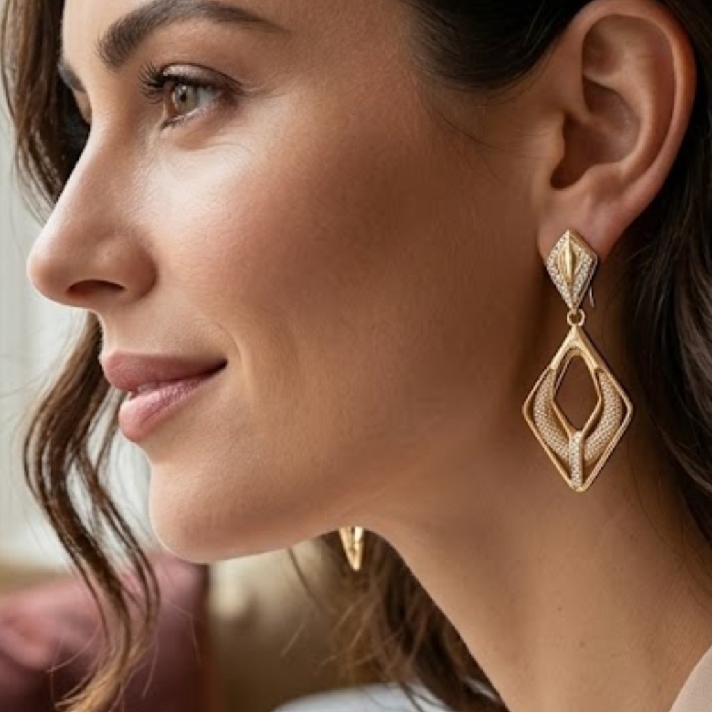 Designed for the modern woman, these earrings feature a sleek triangular silhouette with a smooth rose gold finish that catches light beautifully. The minimalist yet bold design makes them ideal for both everyday wear and special occasions. Whether you’re dressing up for a party or adding a chic touch to your casual outfit, these earrings bring effortless sophistication.